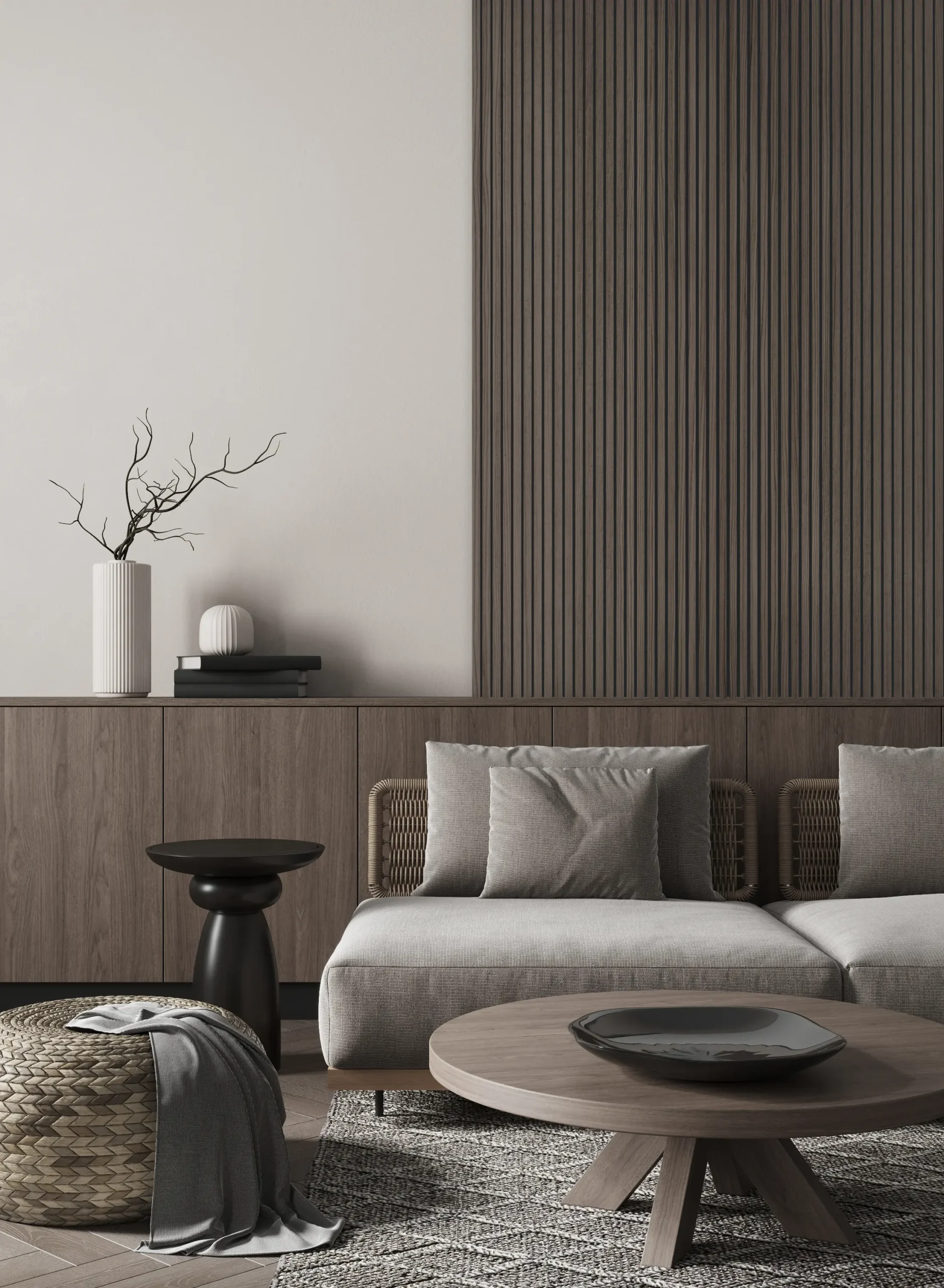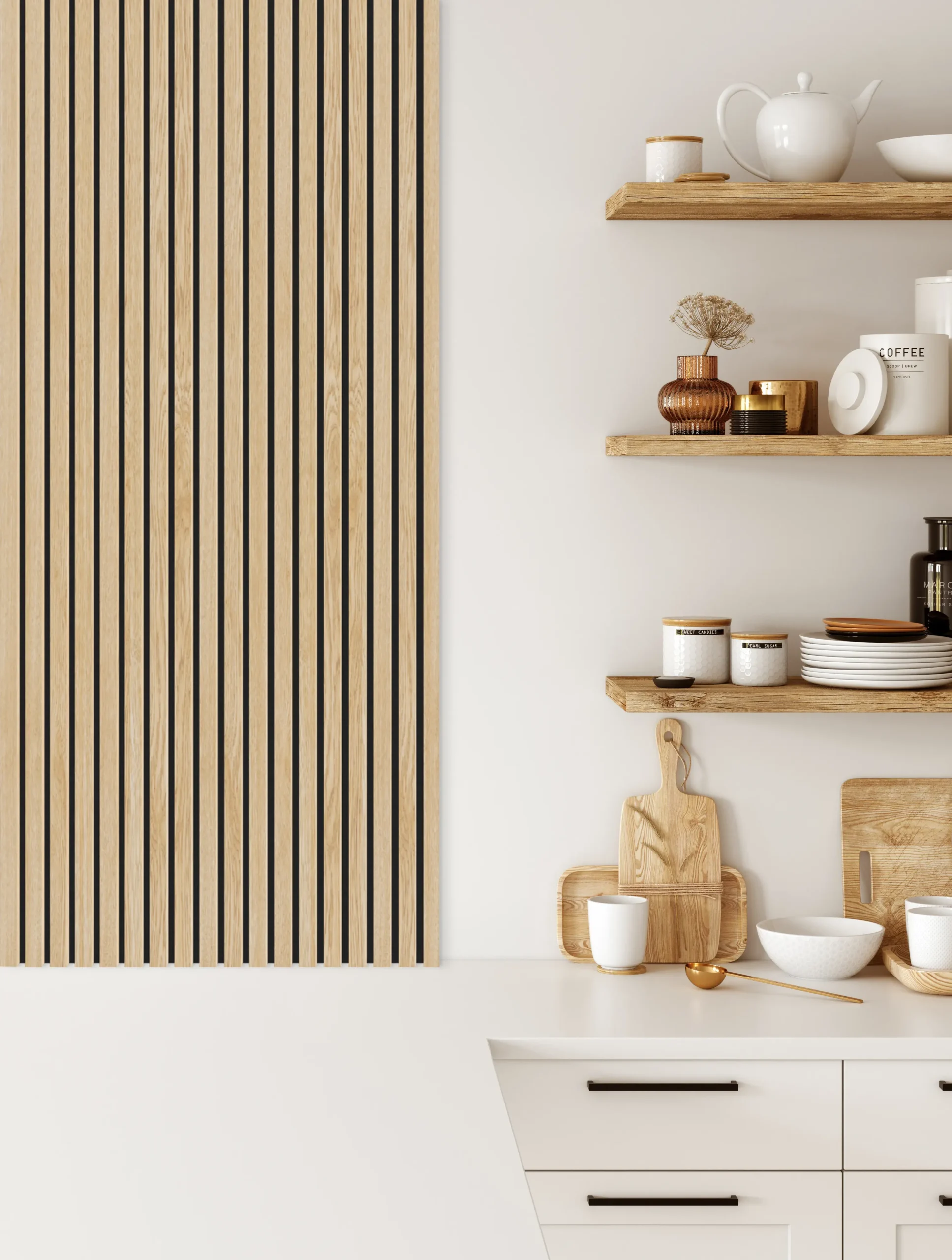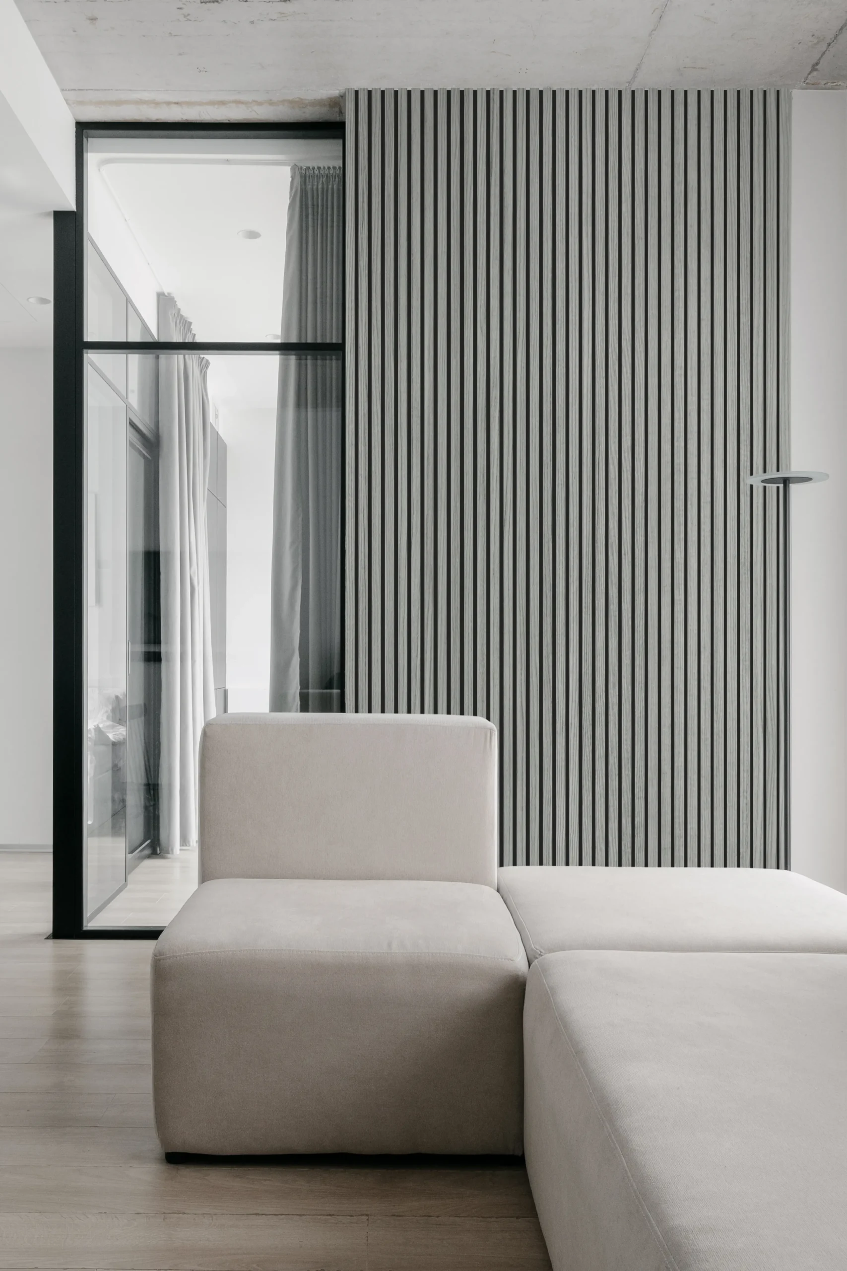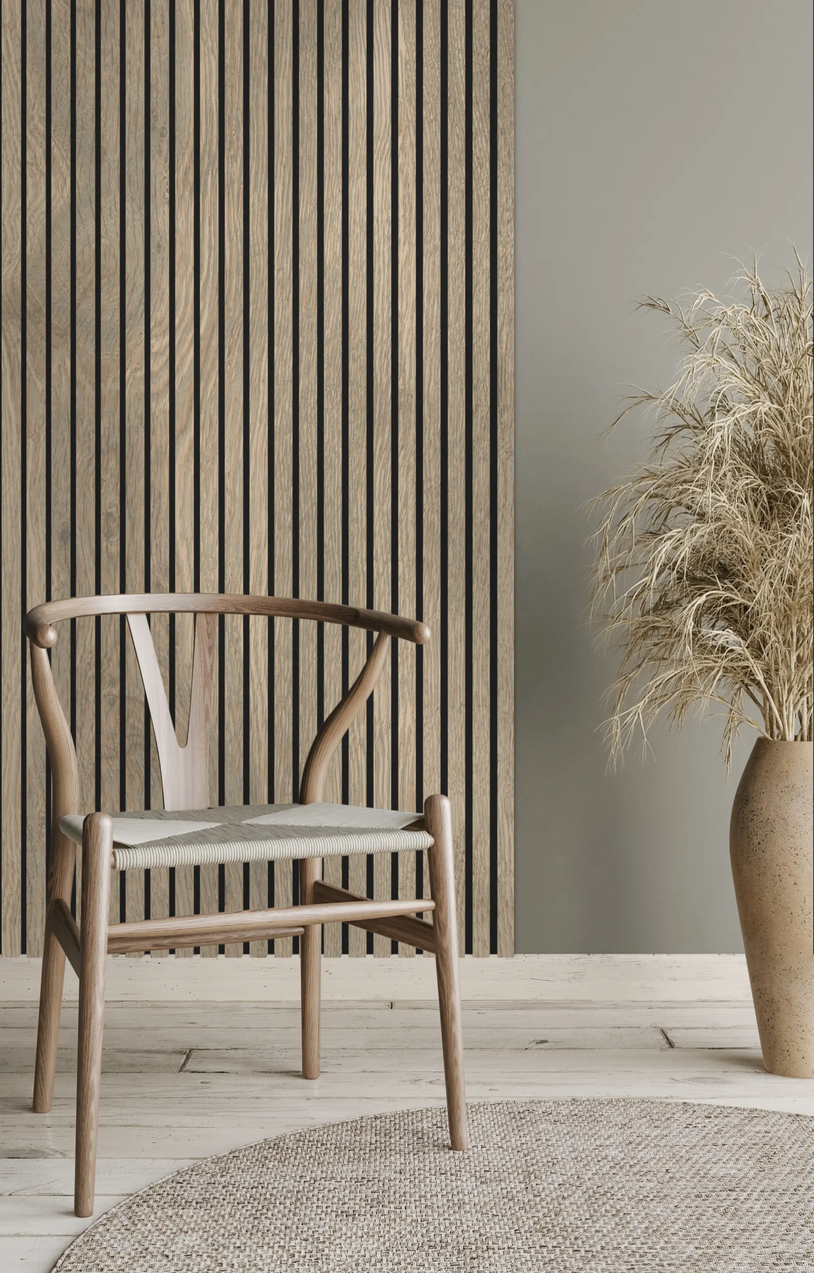 Die klar definierten Lamellen schaffen eine rhythmische, vertikale Struktur, die Räumen Tiefe und architektonische Ordnung verleiht. Das natürliche Furnier sorgt für eine warme, hochwertige Ausstrahlung, während der Filz im Hintergrund den akustischen Komfort spürbar verbessert.