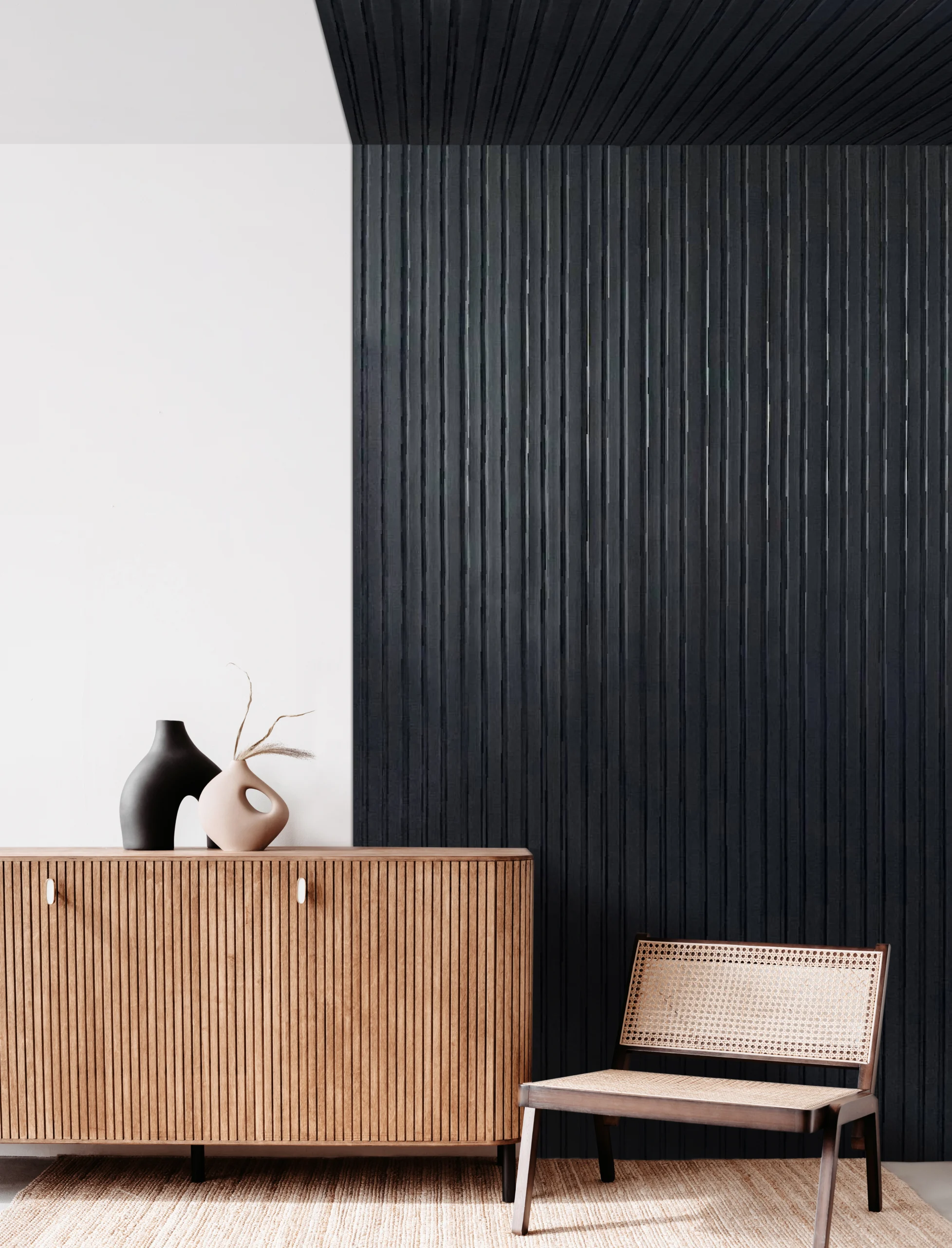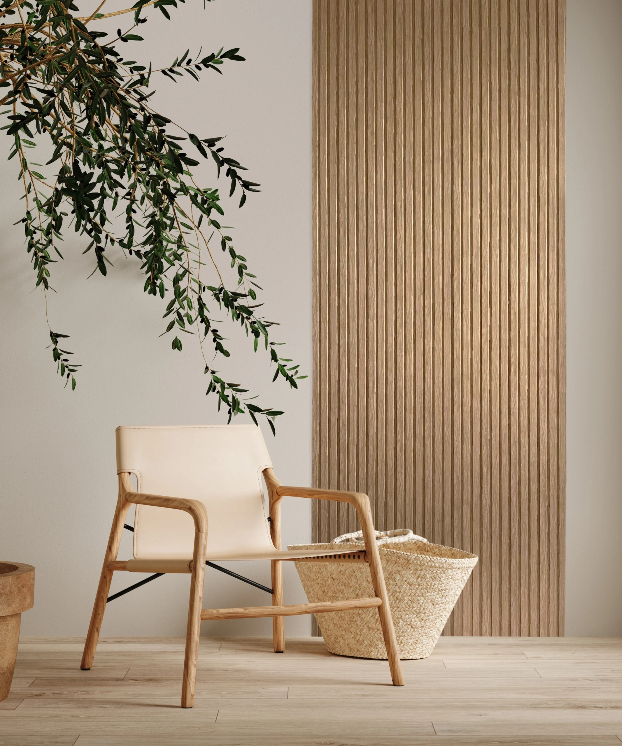 Das Wandpaneel in Holzoptik der Olmo-Kollektion fügt sich perfekt in minimalistische Innenräume ein, in denen Zeitlosigkeit und Vielseitigkeit eine wichtige Rolle spielen. Rolle spielen. Die klare, vertikale Linienstruktur bringt Ruhe und Ordnung in den Raum und harmoniert ideal mit modernen Möbeln und Accessoires.